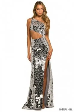 Style 55383 from Sherri Hill is a trendy one shoulder cut glass prom gown with side cut-out and high slit.