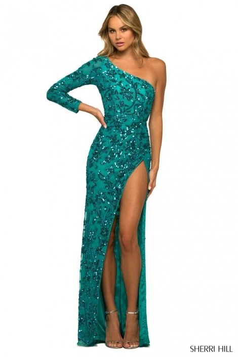 Style 55430 from Sherri Hill is an elegant sequin embellished evening gown with single long sleeve and high skirt slit.