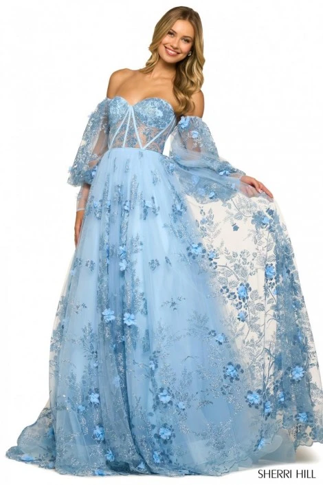 Style 55436 from Sherri Hill is a strapless, tulle ballgown with sheer corset bodice presenting a sweetheart neckline and removable, puffed sleeves. Dainty three dimensional flowers give this prom gown a dreamy, romantic vibe.