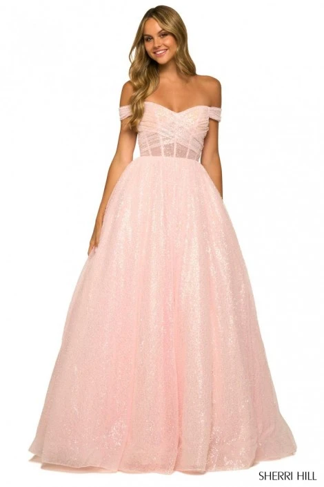 Style 55503 from Sherri Hill is a sweet off the shoulder sequin ball gown with sheer ruched corset bodice and full floaty skirt.