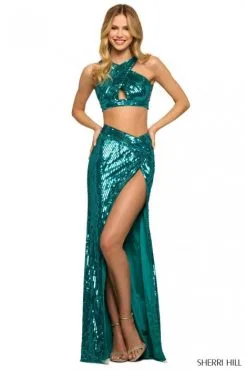 Style 55514 from Sherri Hill is a stylish two piece, sequin prom dress with high skirt slit. The top features a crisscross halter neckline with keyhole front and back clasp closure.