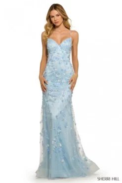 Style 55531 from Sherri Hill is a slim fitting, beaded, floral pattern prom dress with V neckline and over the shoulder spaghetti straps that adjust through the lace-up back closure.
