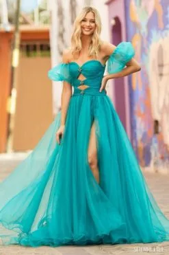 Style 55602 from Sherri Hill is a fun prom gown with a strapless sweetheart neckline, detachable bubble arm sleeves, front diamond cutouts that are ruched and embellished, A-line silhouette, thigh high leg slit and a sweeping train.