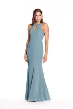 Style 1925 from Bari Jay is a high-neck bella chiffon bridesmaid gown with front and back keyhole, sheer chiffon panels, and A-line skirt.