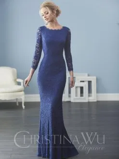 Style 20234 from Christina Wu Elegance has lace streaming from neck to hem in this full-length fitted A-line mother of the bride gown with bateau neckline, V back, and 3/4-length sleeves.