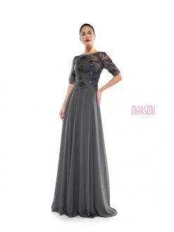 Style M286 from Marsoni by Colors is a chiffon mother of the bride gown featuring an illusion neckline and elbow length sleeves.