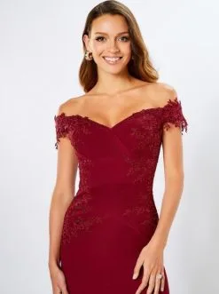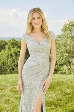 Style M238SL from Marsoni by Colors is a mother-of-the-bride gown with a bateau neckline on the embroidered bodice, sheer embroidered three-quarter sleeves, a V-back, and a flowing A-line chiffon skirt.