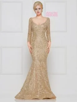 Style M212SL from Marsoni by Colors is a metallic lace mother of the bride gown featuring off the shoulder long sleeves, a scoop back, and a mermaid silhouette.