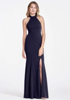 Jaryn style 8803 from Watters is a high halter neck crepe bridesmaid gown with a racer back and a high skirt slit.