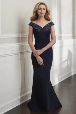 Style 17910 from Christina Wu Elegance is an off the shoulder cap sleeve long jersey mother of the bride dress which is decorated on the neckline with beadwork.