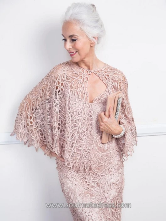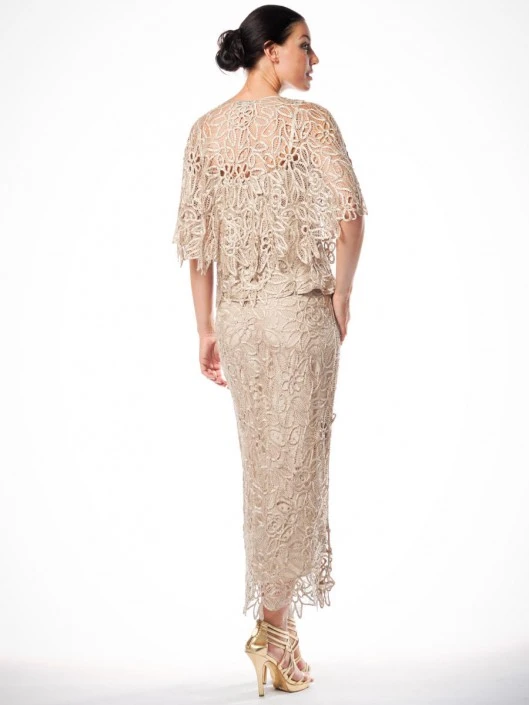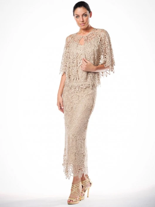 Style C80312 from Soulmates is a silk hand crochet beaded lace 3 piece evening gown consisting of a spaghetti strap cami, a long A-line skirt, and a matching cape with a button at the neck.