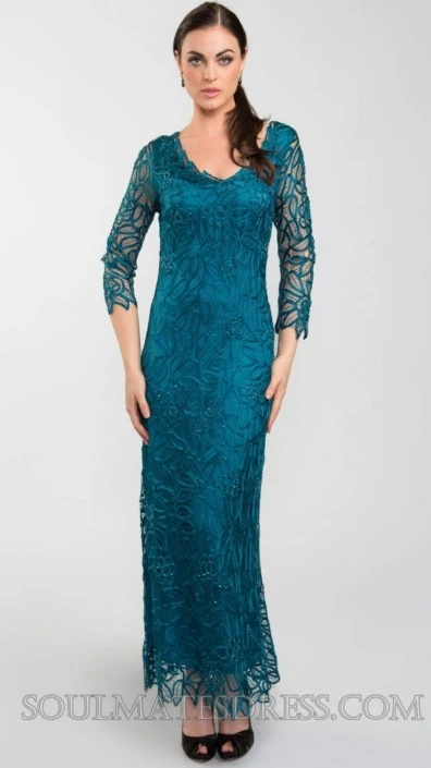 Style C904 Ina from Soulmates is a hip-hugging three quarter sleeve long mother of the bride dress that radiates elegance and sophistication. The beautiful pattern detail adds flair to the slim fitting gown. Sheer sleeves add a hint of flirtation to the traditional gown while providing modesty needed for ceremonies.