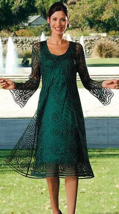Tea length silk crocheted dress has long sleeve duster jacket with bell sleeves