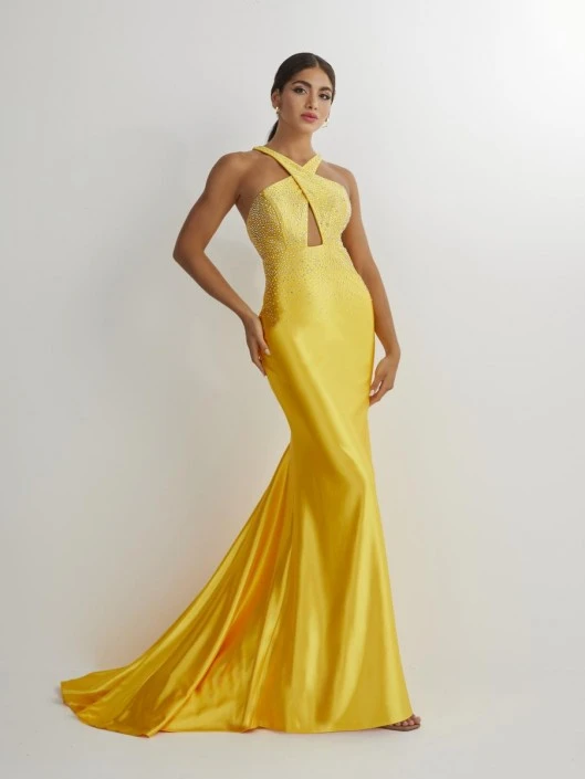 Style 12894 from Studio 17 by House of Wu is a body hugging wrap reverse halter dress in stretch spandex. The bodice is adorned with scattered stones and features a dramatic trumpet skirt.