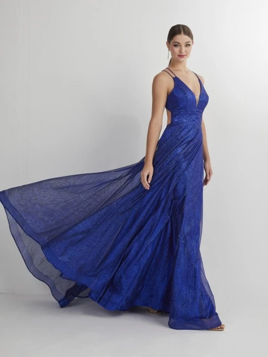 Style 12895 from Studio 17 by House of Wu is a plunging V-neck diamond tulle A-line prom gown with double spaghetti straps and open lace-up tie back.
