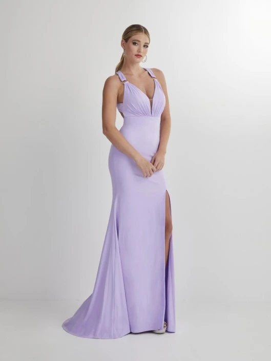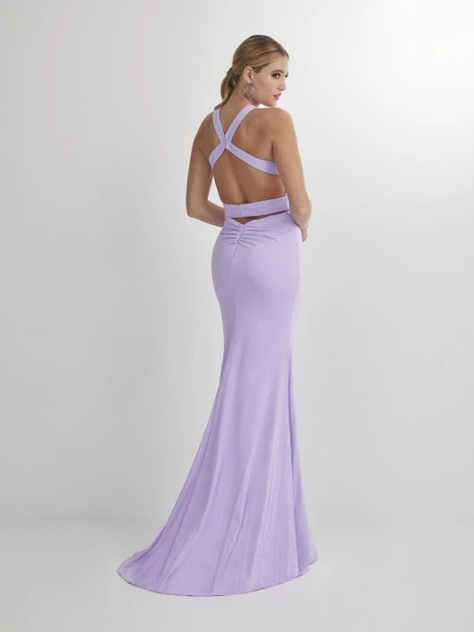 Style 12897 from Studio 17 by House of Wu is a plunging V-neck stretch jersey tank prom gown with pleated bust detail, wide waistband, open back and a front side slit trumpet skirt.