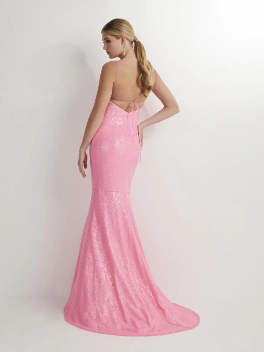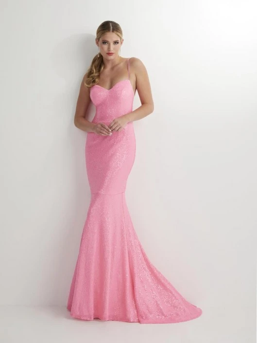 Style 12912 from Studio 17 by House of Wu has neon sequins to light up the red carpet in this sweetheart neck fitted prom gown with a spaghetti strap open tie back, a mermaid skirt and sweep train.
