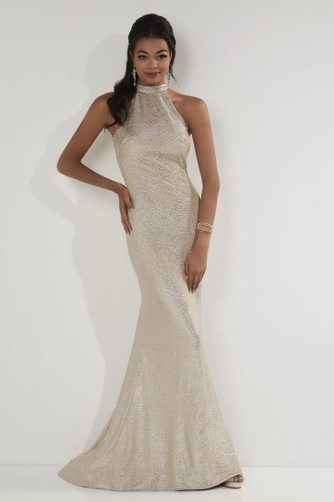Style 12709 from Studio 17 is a shiny metallic jersey prom gown with a animal print look. It has a choker halter neckline, an open back, and a trumpet skirt with train.