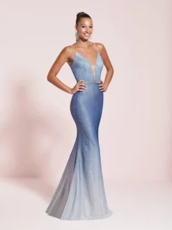 Style 12803 from Studio 17 is a gorgeous prom gown featuring a low V-neckline with spaghetti straps, a fitted body and a flared trumpet skirt in a glitter ombre fabric.