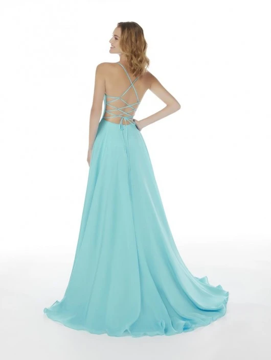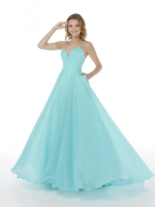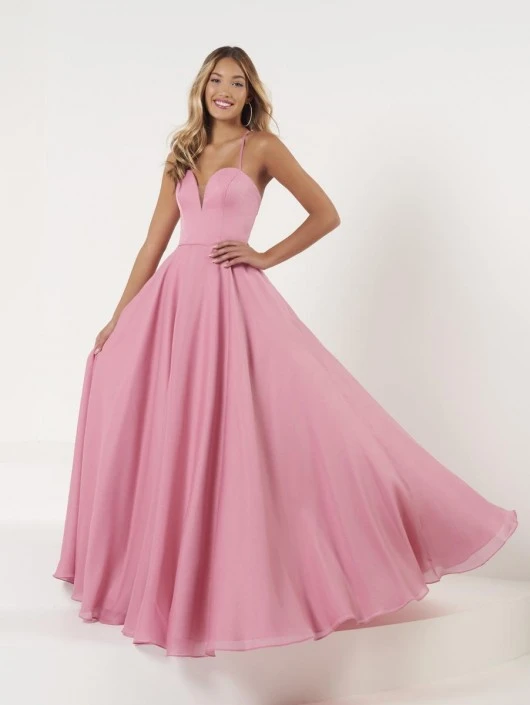 Style 12848 from Studio 17 is a prom gown with a sweetheart neckline, spaghetti straps, flowy A-line metallic chiffon skirt, strappy lace-up back and sweep train.