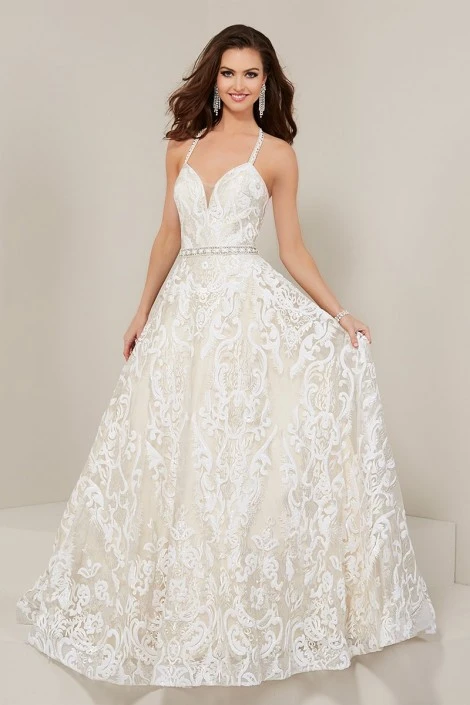 Style 16369 from Tiffany Designs has a sweetheart neckline with beaded straps and waistband. This prom gown is made in Floral Embroidery lace with sequin and has an A-Line skirt and center zipper back.