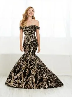 Style 16394 from Tiffany Designs is an off the shoulder neckline sequin pattern fitted mermaid gown with sweep train.