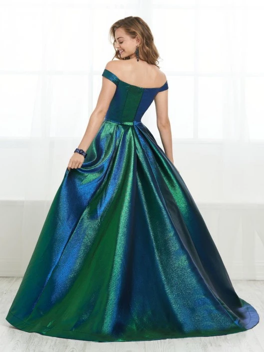 Style 16399 from Tiffany Designs is a sweetheart off the shoulder neckline ballgown with a box-pleated full A-line skirt with side pockets and sweep train.