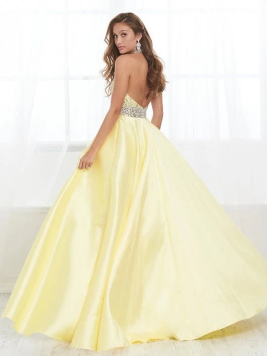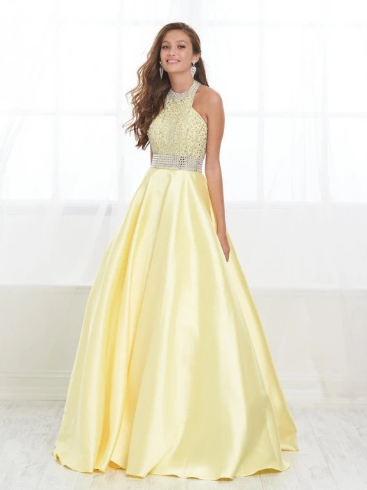Style 16424 from Tiffany Designs has a high halter neck beaded bodice and waistline. a Mikado A-line long skirt, and an open back.