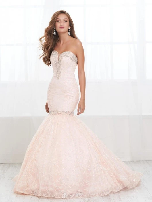 Style 16429 from Tiffany Designs is a rhinestone beaded sweetheart strapless neckline gown that features a fitted mermaid skirt in glitter floral and sweep train.