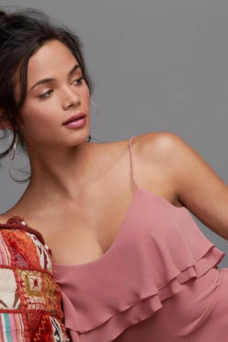 Style 4501 from Watters is the flowing Jasper bridesmaid dress. This gown has delicate layers of Crinkle Chiffon that drape across the bodice. Spaghetti straps, a scoop neckline, open V back, and center front skirt slit complete the look.