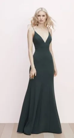 Gazelle style 7800 from Watters is a fitted Ballad Crepe bridesmaid gown that has a deep V neckline, spaghetti straps, and an open V back.