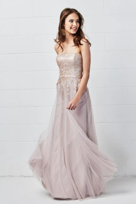 Style 652 from Wtoo is a strapless floor length bridesmaid dress that has Talisa sequins on the bodice and trickling into the bobbinet skirt. This beautiful A-line gown with nature waist provides an ultra-chic but carefree look.
