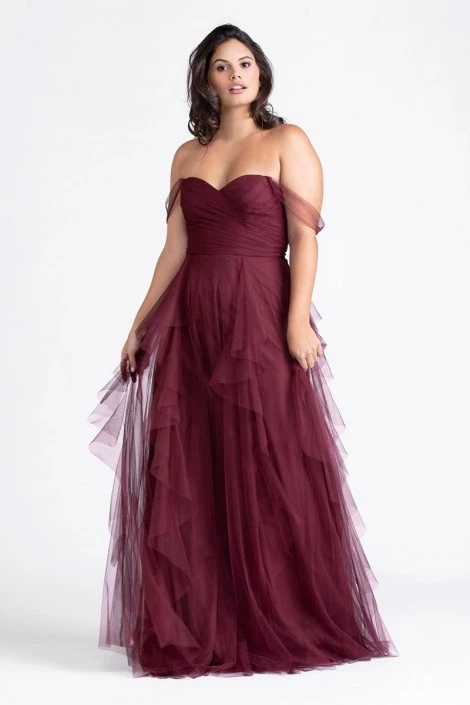 Moore style 147 from Wtoo is an off the shoulder bobbinet bridesmaid gown with a ruched crossover bodice, sweetheart neckline, and softly cascading flounces on the skirt.