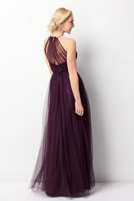 Style 242 from Wtoo is a floor length Bobbinet bridesmaid dress that has a sheer high neck with keyhole.