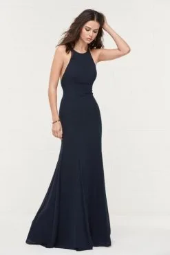 Style 400 from Wtoo is a high neck halter fit-and-flare long bridesmaid dress. Body skimming Inna chiffon scoops to a low back, highlighting lace-up ties.