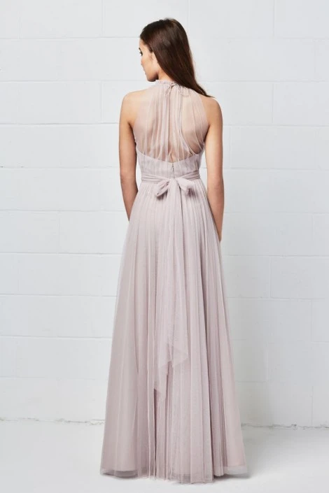 Style 641 from Wtoo is a floor length Bobbinet bridesmaid dress that has a sheer high halter neckline, a natural waist with tie back sash, a sheer back overlay, and a softly gathered skirt. A uniquely elegant and contemporary style for your bridesmaids.