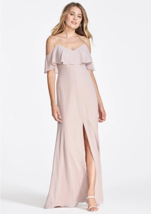 Alexia style 920 from Wtoo is a romantic ruffle top cold shoulder plush chiffon bridesmaid gown with spaghetti straps and a center front skirt slit.