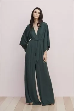 Sawyer style 863 from Wtoo by Watters is a flowy melody georgette wrap bridesmaid jumpsuit with a deep V neckline, a tie belt, and flowy three quarter length sleeves.